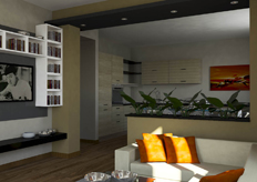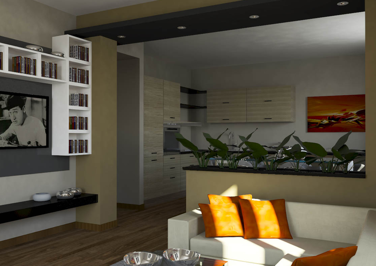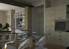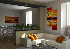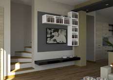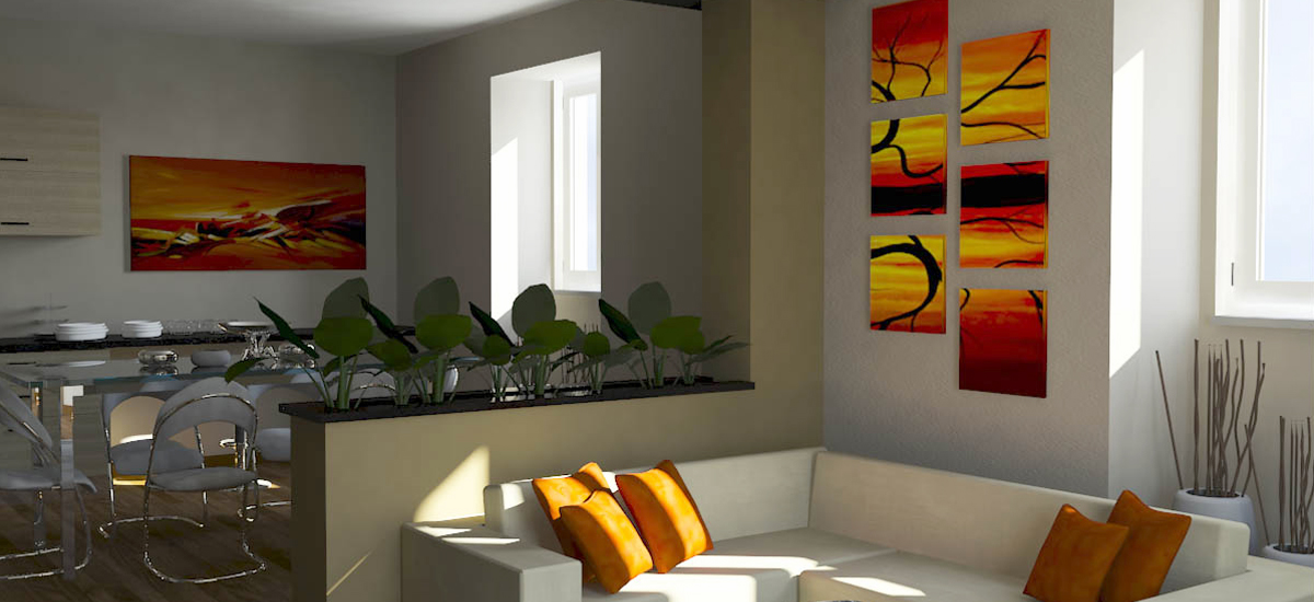 Rendering fotorealistici della zona giorno di un appartamento duplex; viste del soggiorno, sala da pranzo, e delle scale d'accesso alla zona notte.