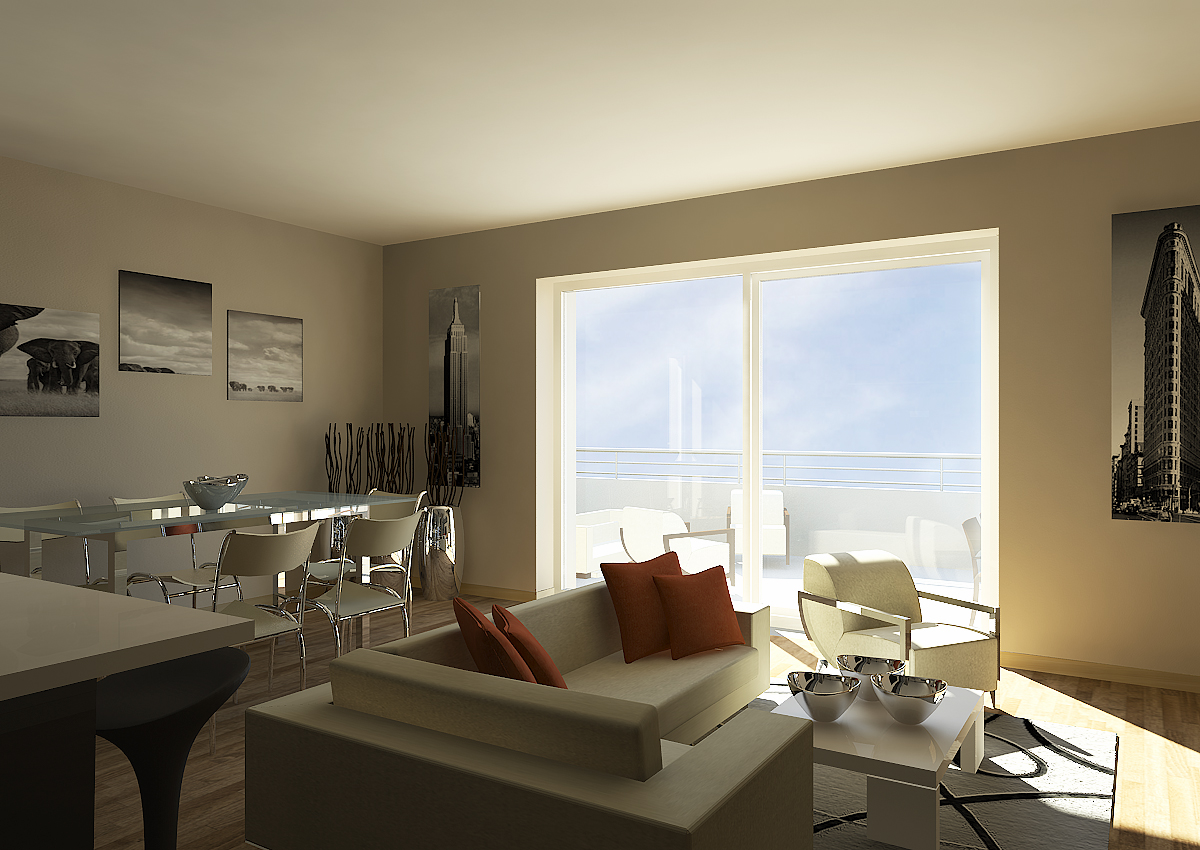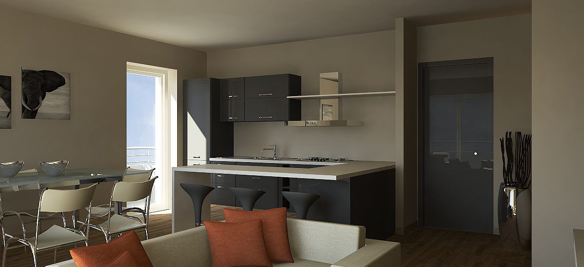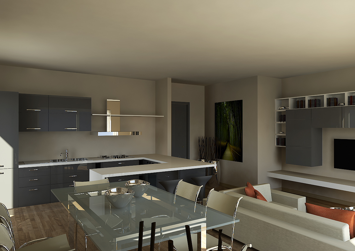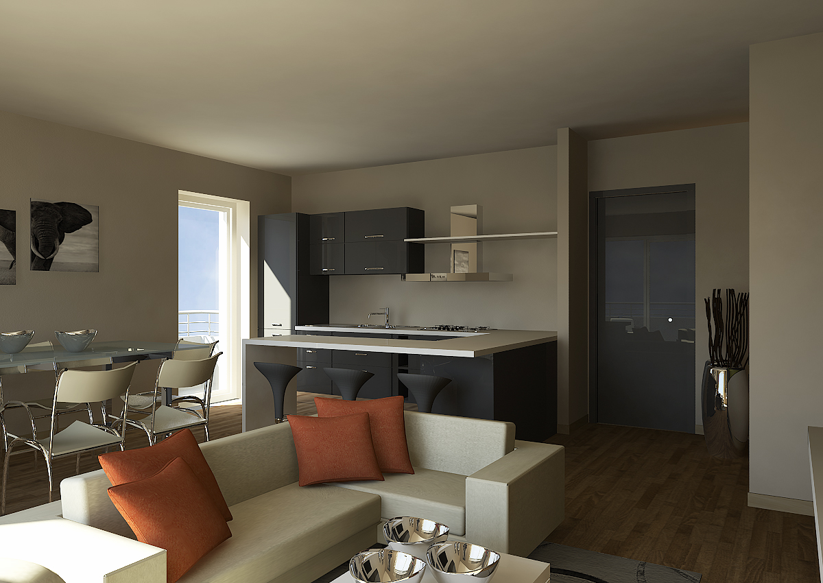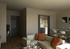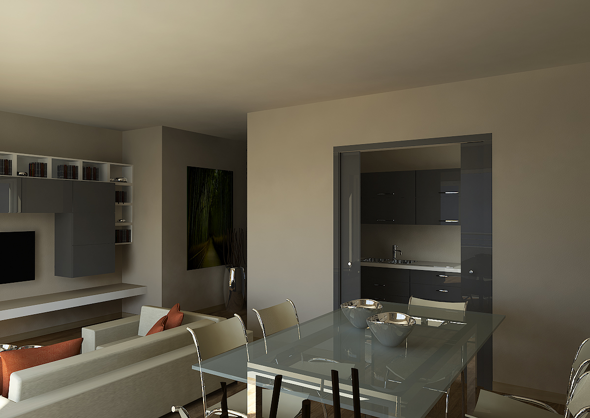 Per il progetto di interior design degli appartamenti residenziali in una palazzina residenziale sono stati realizzati rendering fotorealistici delle zone giorno dei vari