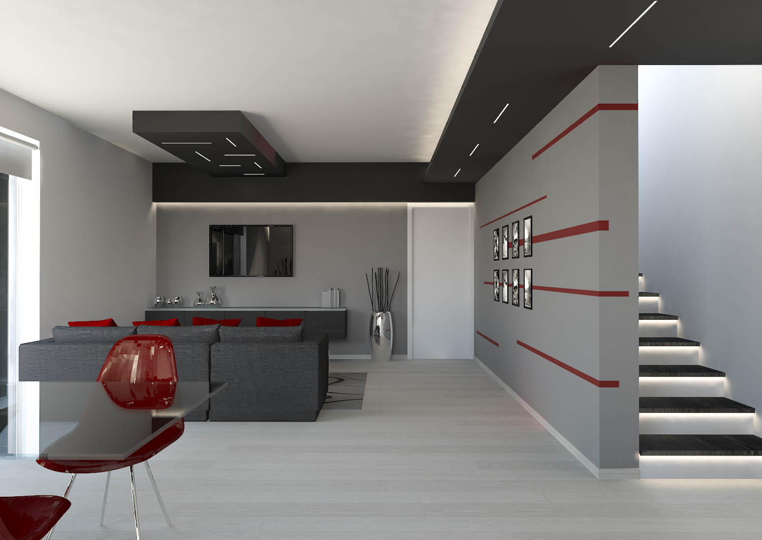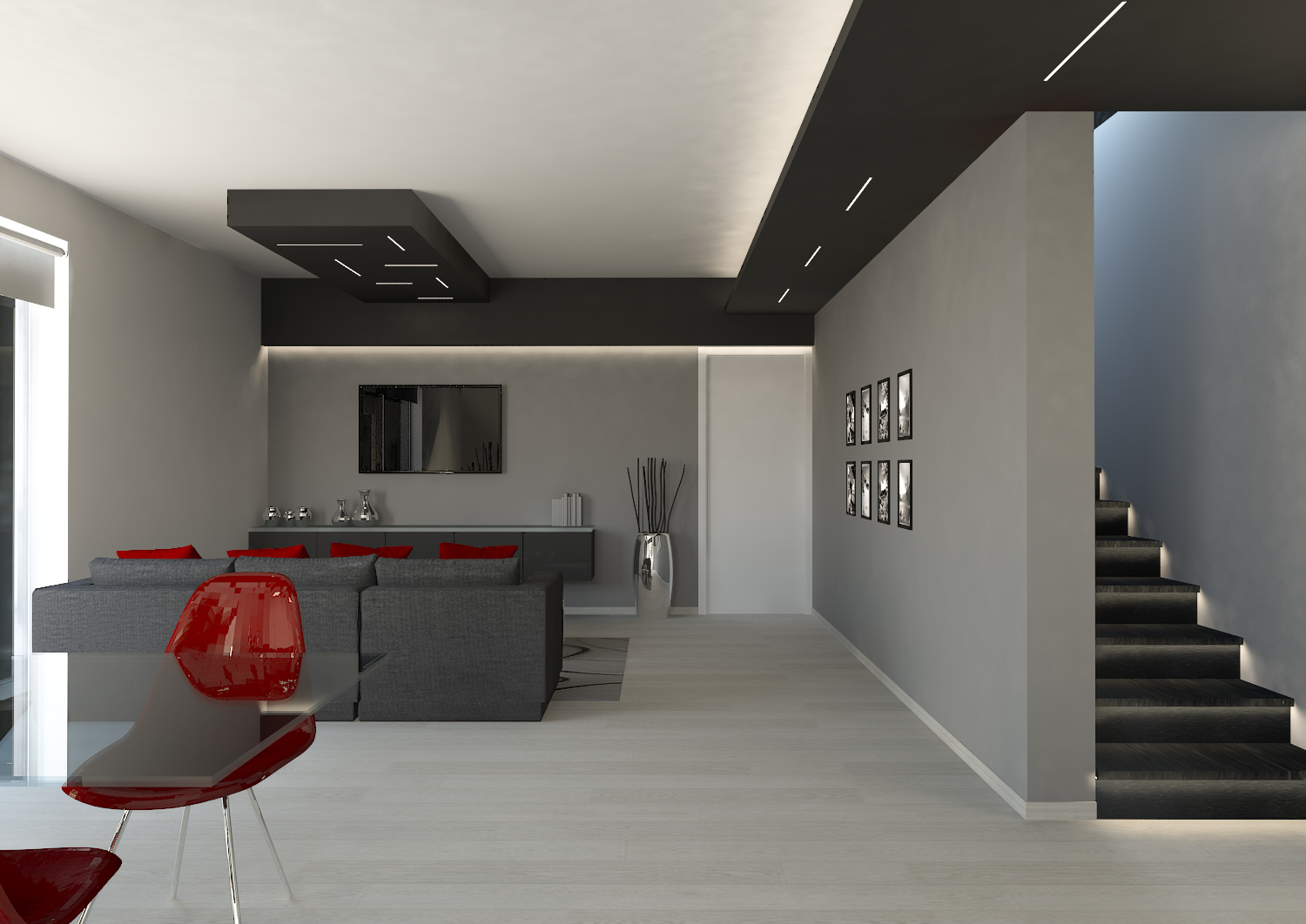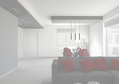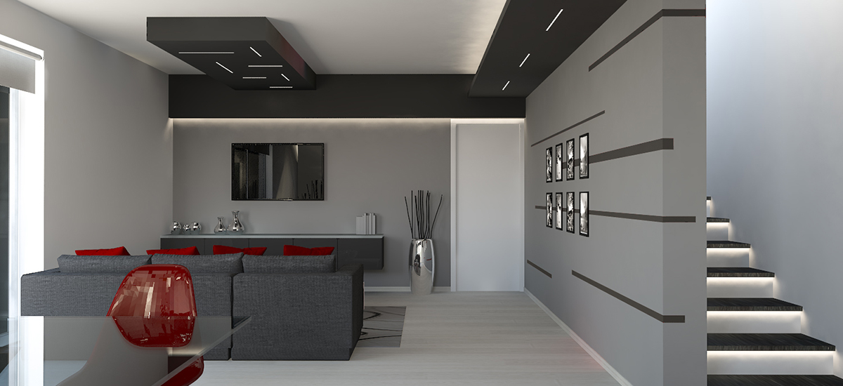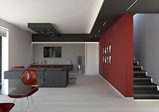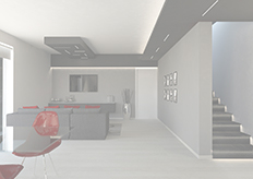 Due 'cassettoni', una veletta con luce a cascata sulla parete trasversale, il controsoffitto dell'ingresso e la veletta longitudinale a lato della scala sono