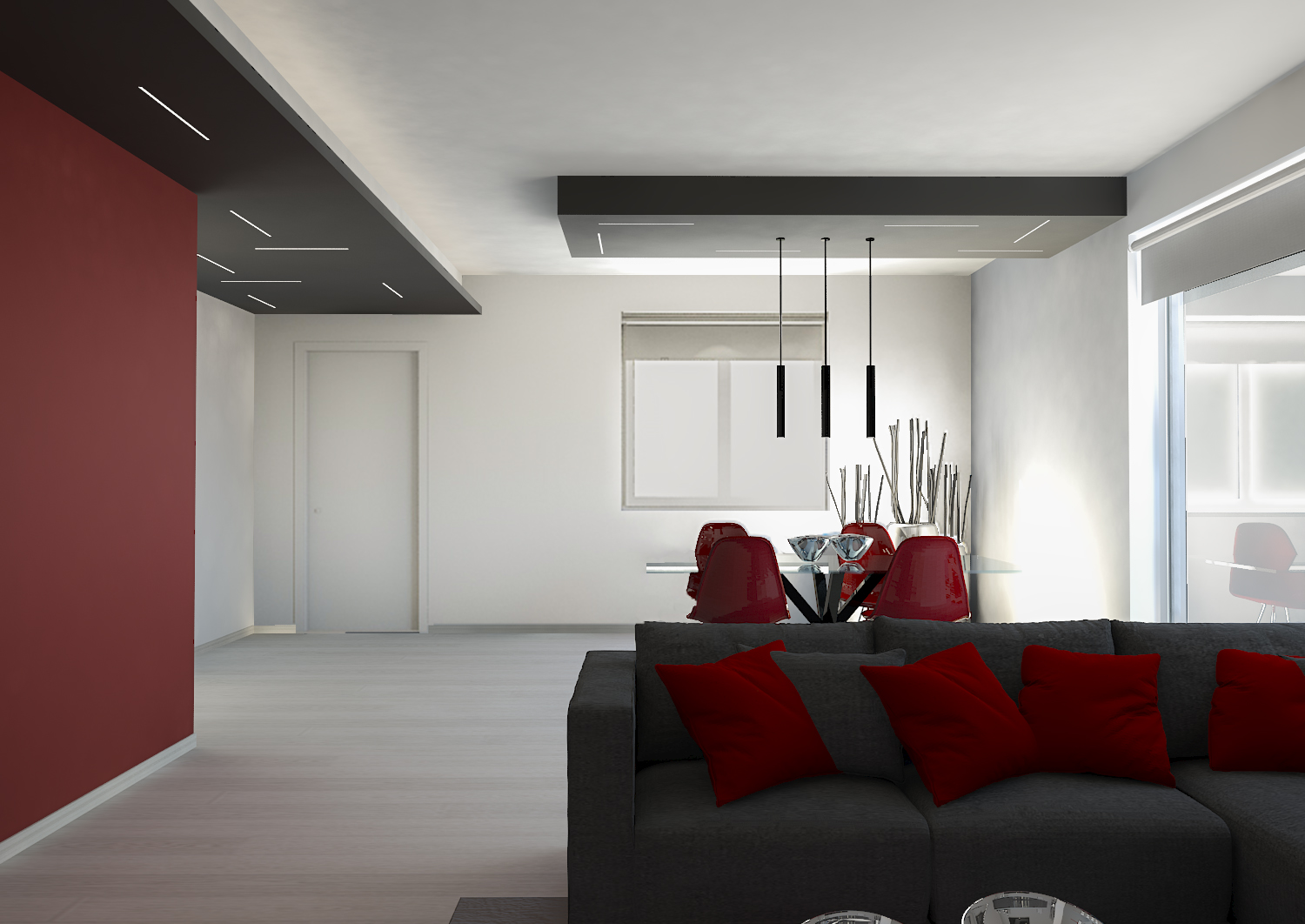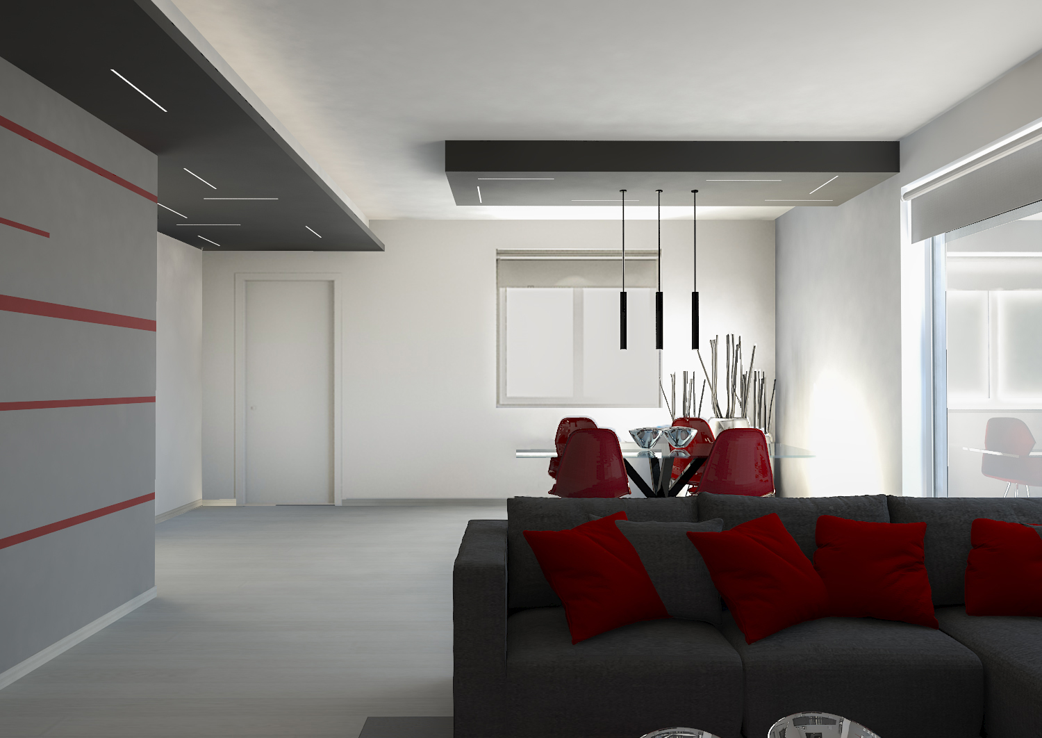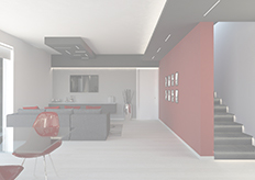 la cromaticità dell'intero appartamento; mentre la parte rossa o la soluzione con le strisce rosse seguono la discontinuià cromatica degli arredi.