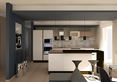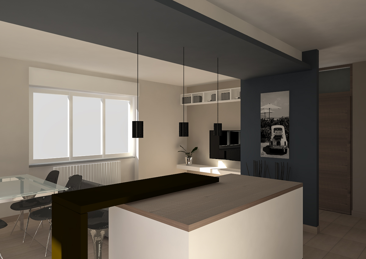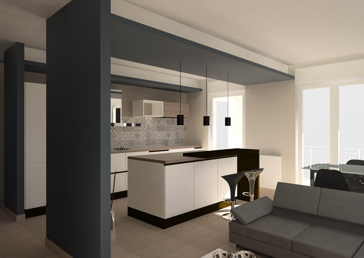 Con la demolizioni delle pareti della cucina e dell'ingresso si è realizzato un ampio e luminoso openspace. Per distribuire sia funzionalmente che visivamente le viarie funzioni della zona giorno, è stata realizzata una parete che funge da quinta d'ingresso, posta proprio davanti alla porta d'entrata. La parete unita con il controsoffitto della zona pranzo, forma un un portale tra la cucina e il soggiorno.